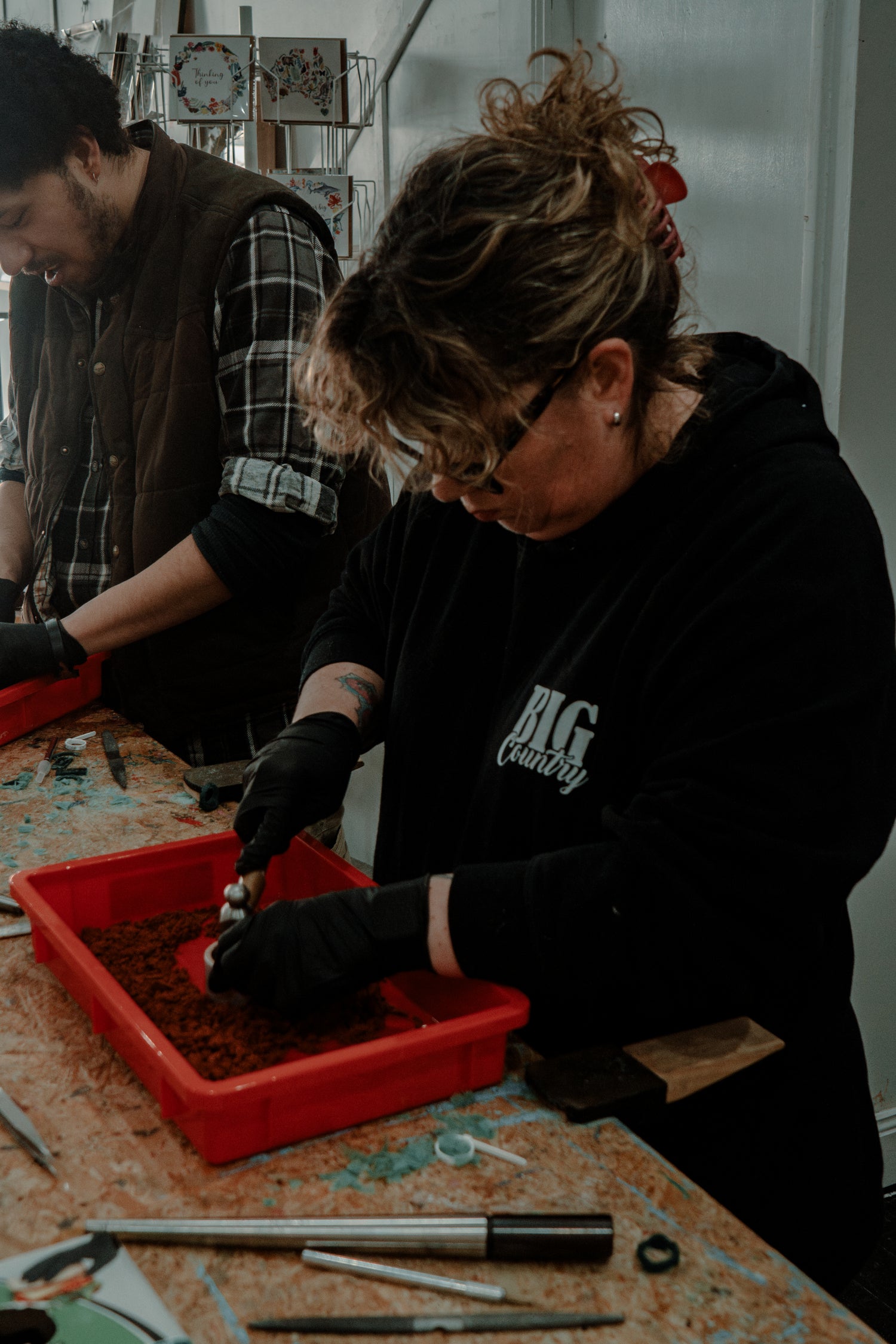 This immersive 5 to 6 hour workshop guides you through the process of carving your desired ring design from wax, creating a mould with Delft clay, and then melting and pouring metal into the mould to cast your piece. Afterward, you'll refine your creation through cutting, filing, and polishing. Please note that this workshop is ideal for experimenting with shapes and textures, fine etchings in the face may not transfer well due to the nature of sand casting.